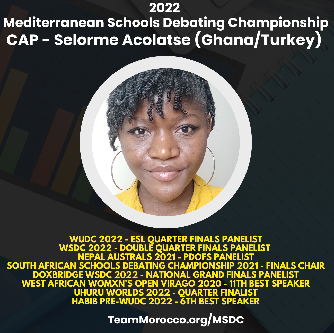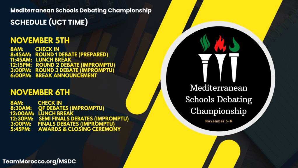 Morocco Debate Association is excited to host the Mediterranean Schools Debating Championship (MSDC) this November. MSDC will have two divisions one for high school teams and one for middle school teams. There will be 3 rounds of debate in the preliminary round and then a break to the quarter finals.